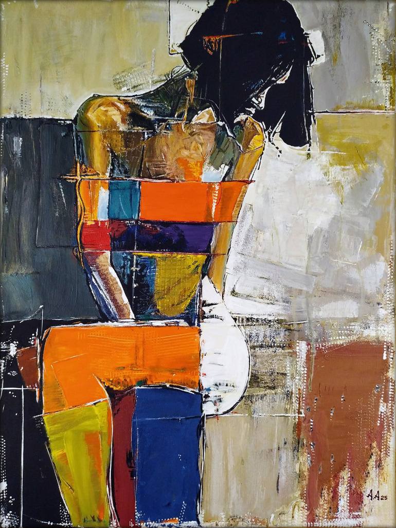 "Hidden Emotions" by Alexander Aksyonov is a striking portrayal of layered human complexity through abstract forms and bold colors. The painting features a seated figure rendered in fragmented blocks of vibrant orange, blue, yellow, and deep black, set against a muted, textured background. The figur...