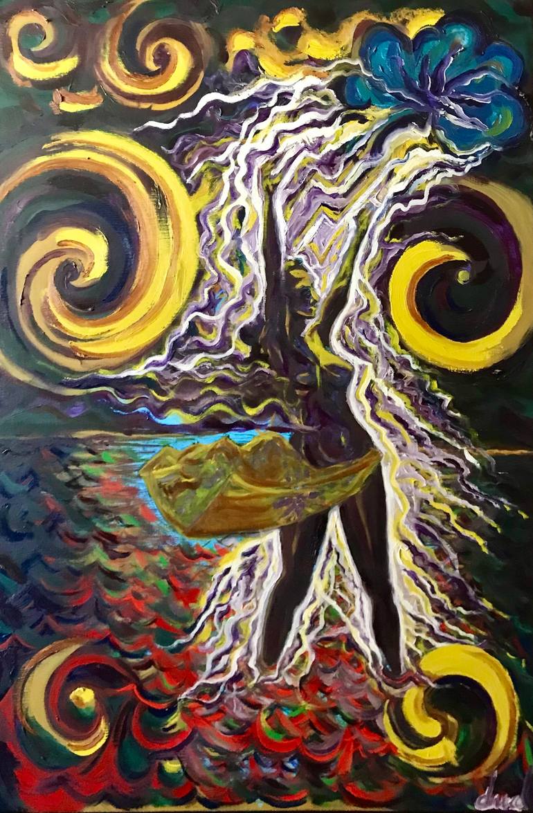 This work was inspired by my Tahitian wife Colette and her struggle with cancer and the struggle with my own grief and that of my children from losing their mother. I hope viewers will understand the symbolism here is Tahitian and the medium was predominantly inspired by the famous post Impressionis...