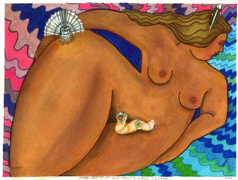 Maui is a well known figure in Maori legend. Here he is seeking eternal life and discovers that the gateway is through the goddess Hine nui te Po's vagina. He transforms into a caterpillar to make the task easier, but the fantail, the goddess's watchbird sees him and awakens the goddess, who catche...
