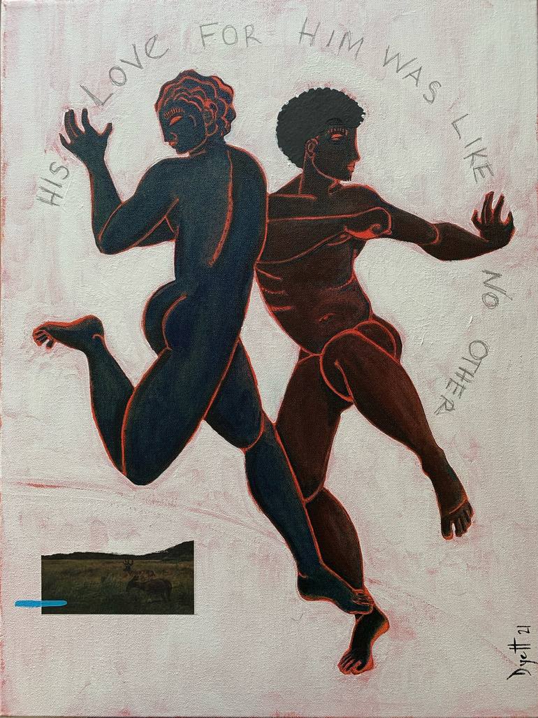 Acrylic, collage, Pencil on canvas “His Love”. His love for him was like no other.