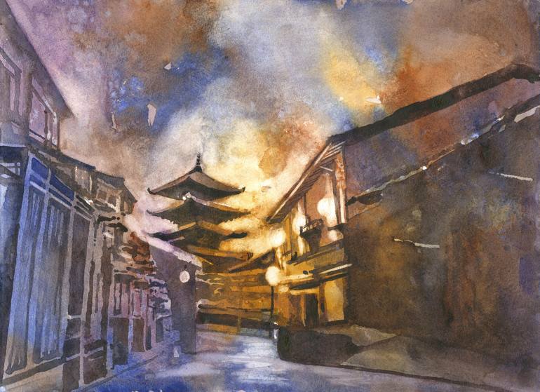 Hōkan-ji Temple (Yasaka Pagoda) in Kyoto Japan Buddhist pagoda historical monument colorful watercolor painting Japanese wall decor trave essentials. 11x15" watercolor on 140 lb professional watercolor paper. Hand signed by artist. Unframed. This painting is based on the artist’s original trave...