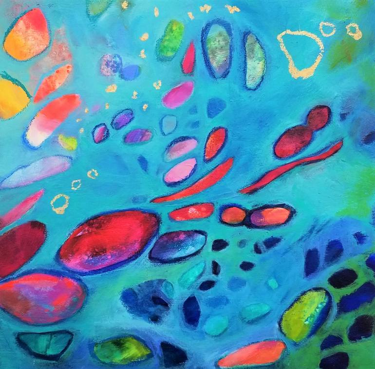 This painting was inspired by the aquatic sea life and vibrant colors of the Caribbean Sea, in particular Ambergris Caye in Belize and the Hol Chan Marine Reserve. I hope the viewer will feel the warmth of the ocean there and the special vibrancy and energy of the oceanic wildlife.
