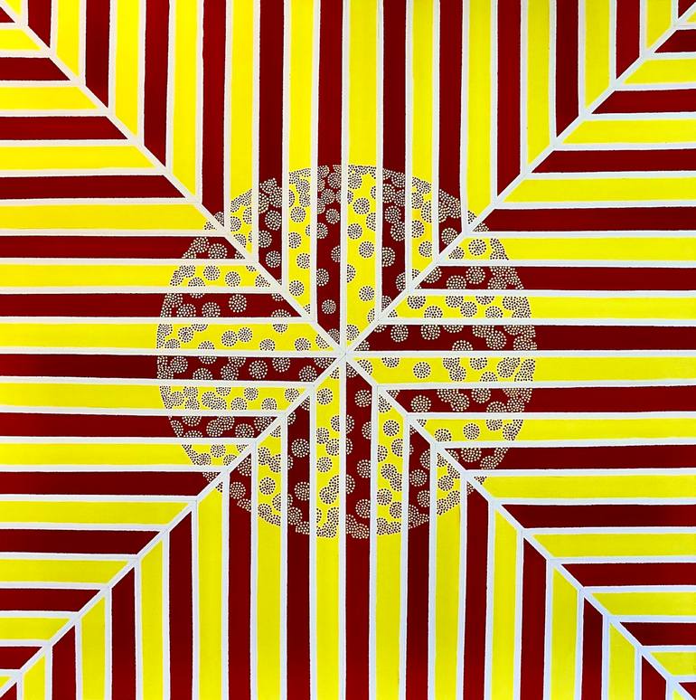 The artwork consists of bold geometric patterns and vibrant colors. A central circle, divided into four segments, contains intricate dot patterns in alternating red and yellow hues. Radiating outward from the circle, alternating diagonal red and yellow stripes are separated by white lines. The preci...