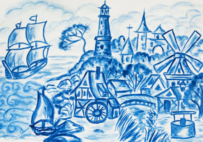 Painting: Watercolor on Paper, landscape in blue color, in style of traditional Dutch tiles.
