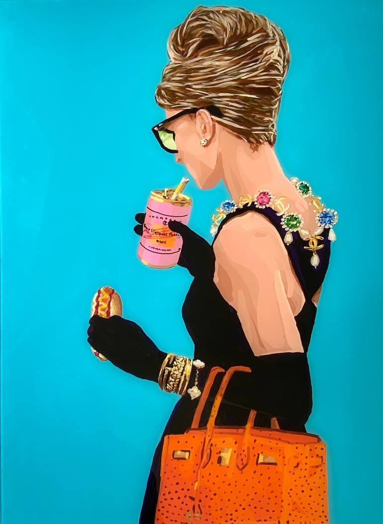 The embodiment of understated elegance Audrey Hepburn as Holly Golightly in Breakfast at TIffany's - in my version with a New York hot dog (Audrey hated the danish she had to eat in the movie) and with my signature can of Veuve Clicquot Champagne in the other. hand painted in acrylics on lucite che...