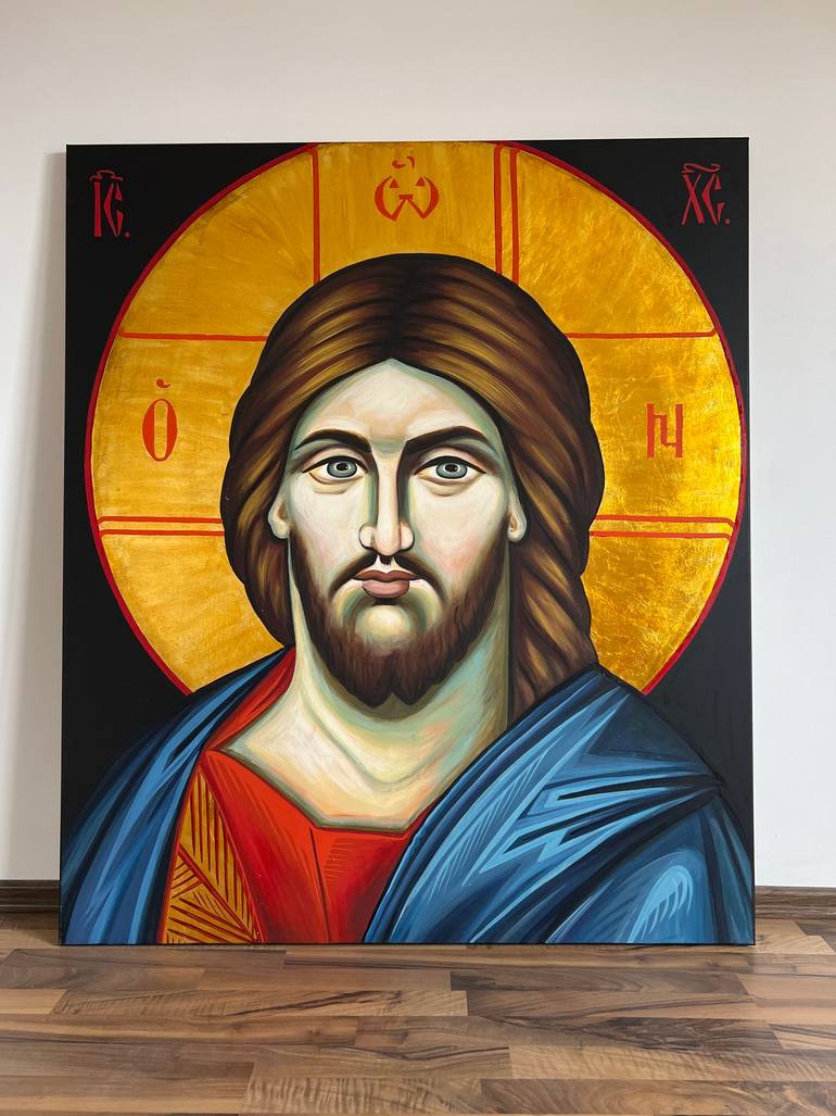 My painting of the Holy Virgin of Christ exudes a divine solemnity, with every detail outlined in a subtle play of light and shadow against the deep black background. The central figure, surrounded by a gilded nimbus, expresses a sacral presence, and the delicate expression of the face conveys a dee...