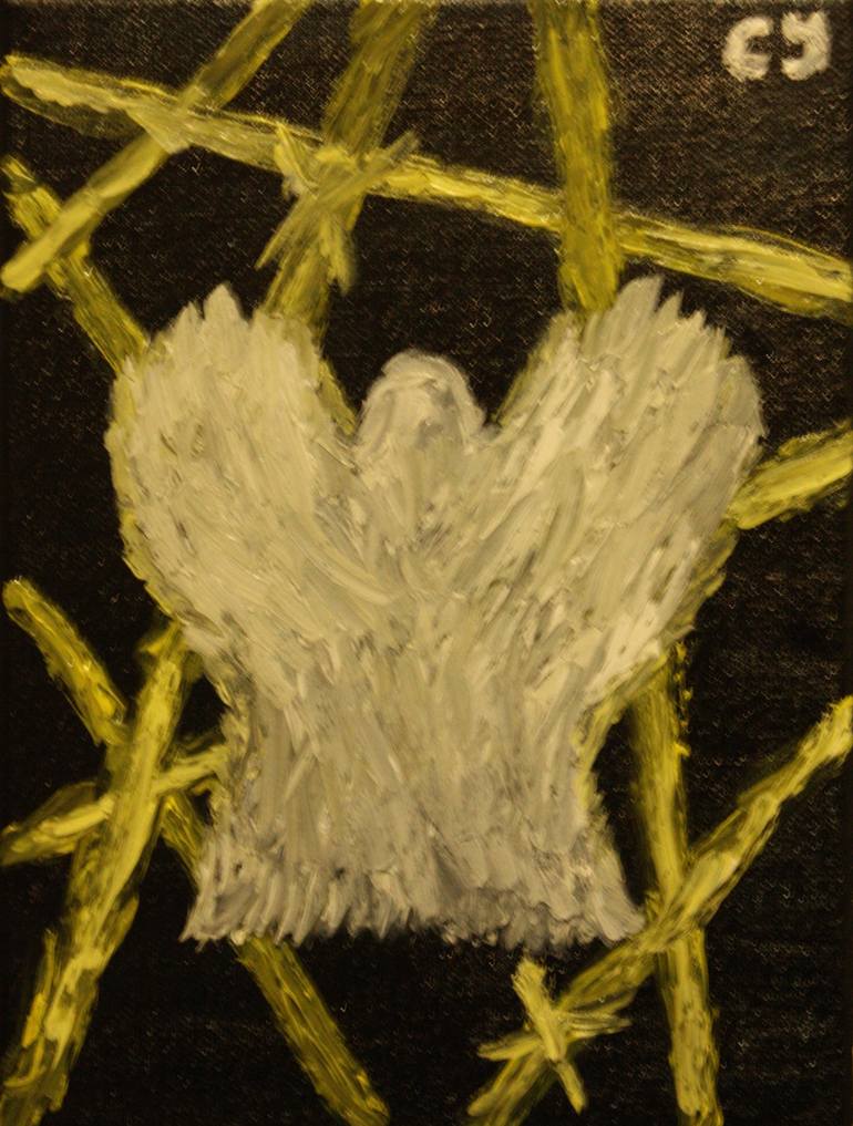 This was Cy's first painting after a long break. He was fascinated by the A$AP Rocky track "Holy Ghost". The angel depicted in the painting symbolizes peace and freedom, and the yellow lines mean both obstacles and the light of hope, which is so necessary in dark times.
