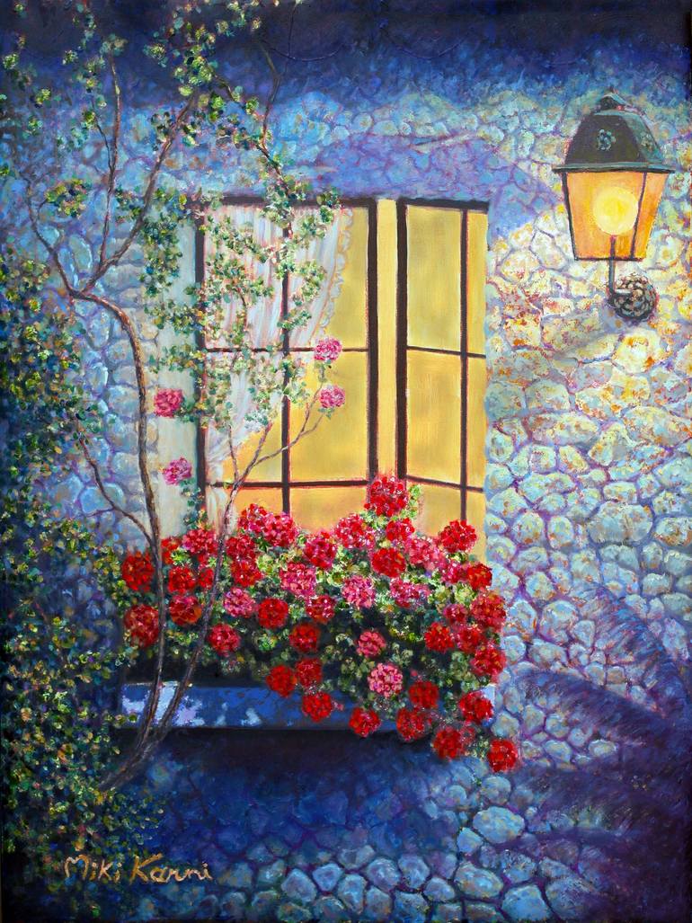 This original oil painting by Miki Karni captures a warm Mediterranean evening through a glowing window framed in ancient stone. Lush geraniums spill from the flower box beneath, kissed by the light of an antique lantern. A white lace curtain drifts gently behind the open shutters, offering a glimps...