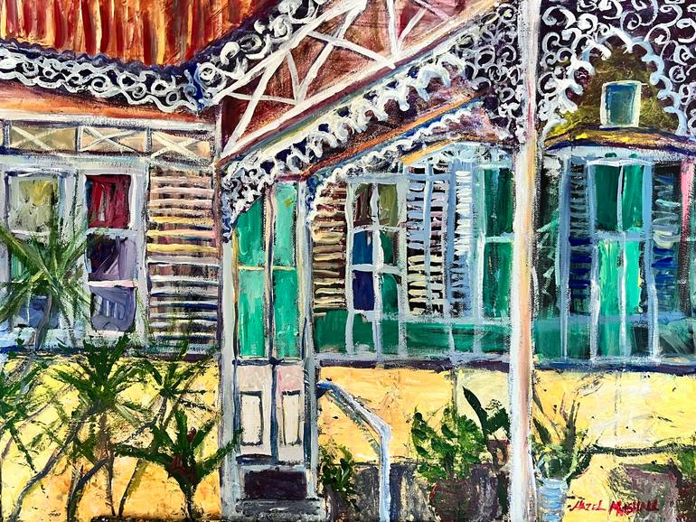 Inspired by the charming quaint Gingerbread houses in the Caribbean where our grandparents lived. Acrylic on canvas captured the rustic style of this home.