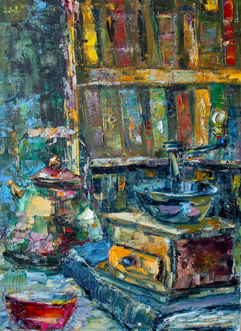 Original oil painting. Home still life. Coffee. Dishes. Bookshelves. A tea set. Painting for the kitchen and living room. Handmade. The size of the picture is 40 by 30 cm. A beautiful, bright and juicy composition will decorate and complement your interior. =========================================...