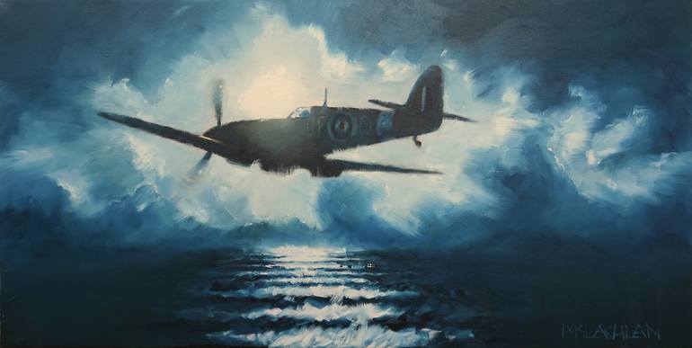 'Homeward Bound' is a striking oil painting on canvas, a monotone silhouette of the iconic Spitfire. The artist's impressionistic style lends an atmospheric quality to the piece, evoking a sense of flight and freedom. The scene hints at a vast seascape below, enhancing the feeling of soaring through...
