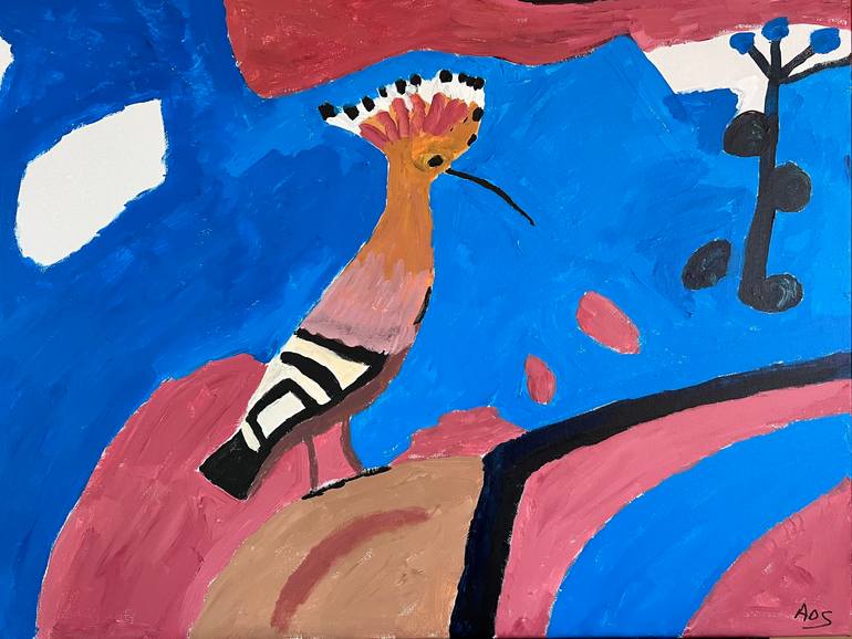 On the hills around my studio there are a few Hoopoe birds. They are quite distinctive and inspired me to represent one in an abstract setting. The style is Hockney and I have used bold colours to represent the environment.