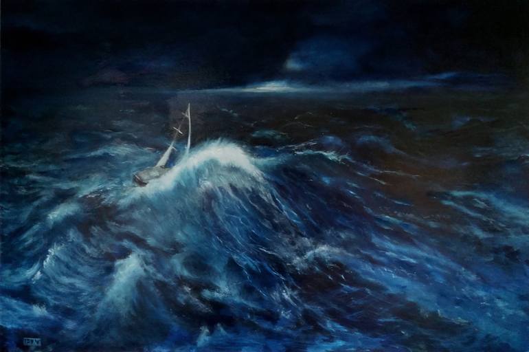 The painting depicts personal growth through adversity. Deep turbulent ocean waves almost consume the small struggling sailing boat with a glimpse of the sun on the horizon almost peeking through the stormy clouds ahead. I chose Prussian Blue and worked the tints and tones to capture a moment of t...