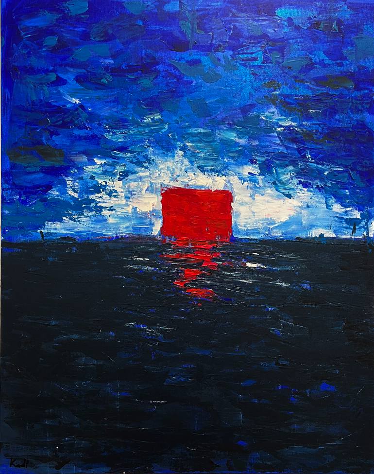 "Hope" is a bold abstract expressionist painting that explores the themes of resilience and personal conviction. The composition is dominated by a large, textured red square in the upper half, acting as a stylized boat that looks like a sunrise over a turbulent, dark blue and black landscape represe...
