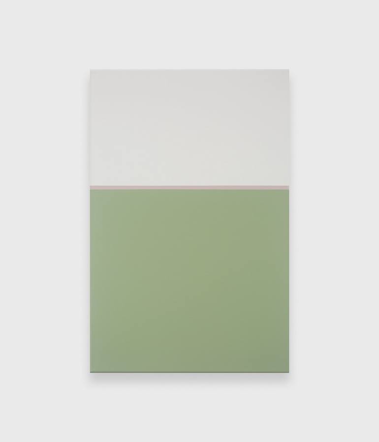 A subtle pink line is the only marker that separates a pale rising lawn green against a milky cloud.