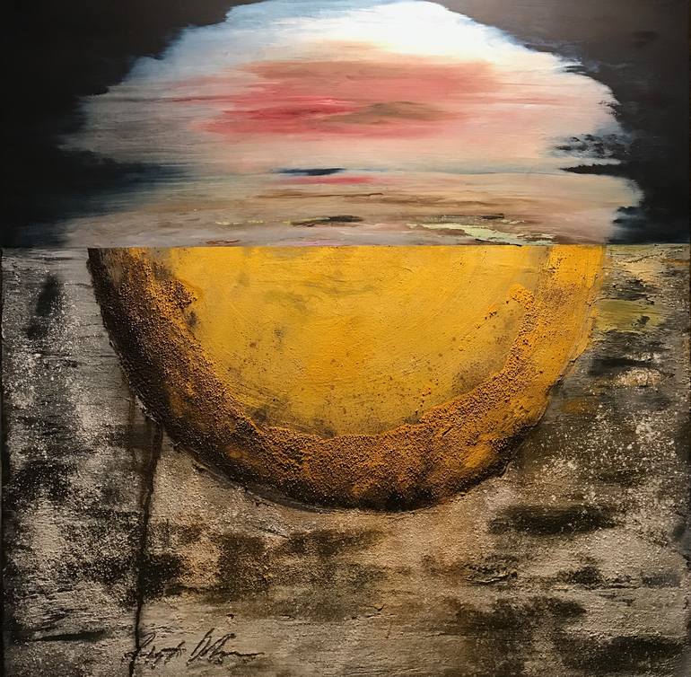 Oil, dry pigment and powdered marble on an acrylic base. Hoping viewers will engage their vision and imagination to consider what is beyond the horizon...