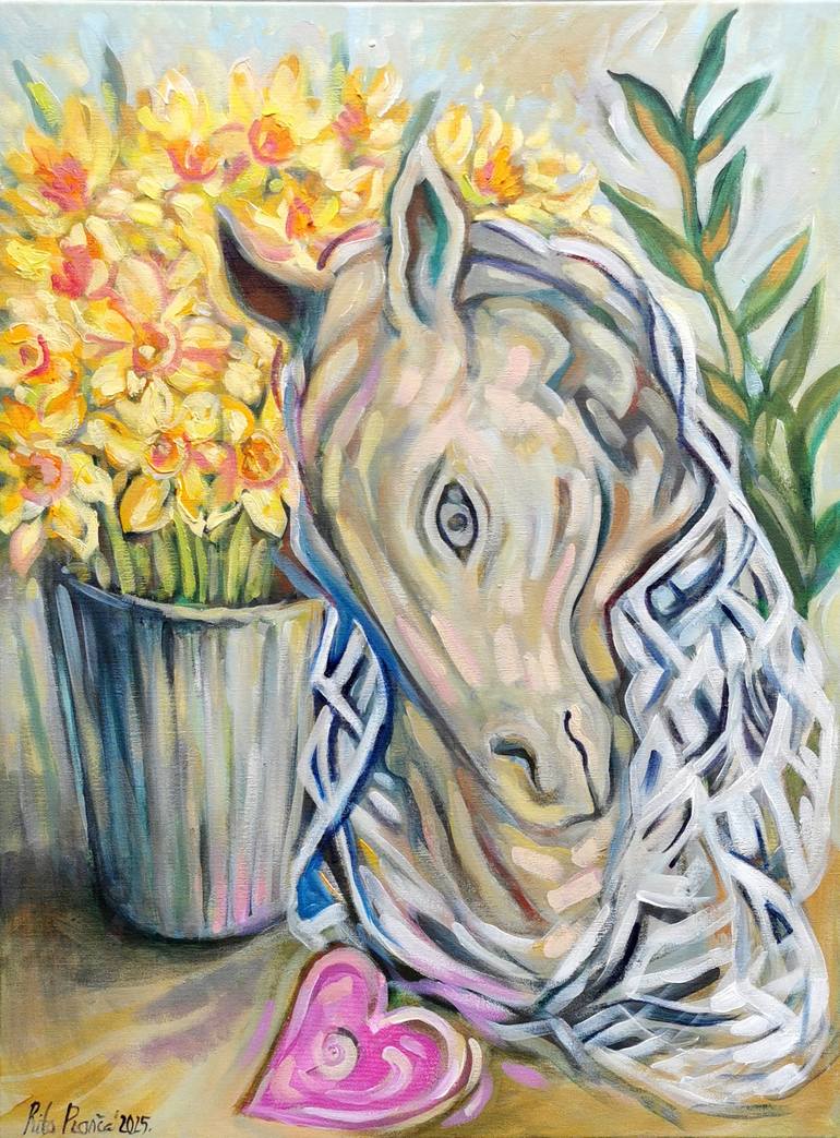 This beautiful oil painting on canvas, "Horse Head with Daffodils," captures the essence of spring. The bright painting depicts a horse head with vibrant yellow daffodils in a vase, a still life bursting with life. Inspired by the artist's sculptural work, this Impressionistic piece with Art Nouvea...