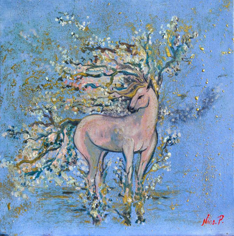 Title: "Spring Horse" Size: 20x20 cm (7.9" x 7.9") Medium: Oil on stretched canvas (gallery wrapped), ready to hang Year: 2021 Description: Spring Horse is an image of harmony between masculine and feminine polarities. Spring and flowering depict a symbol of new life, and rebirth. A horse is a s...