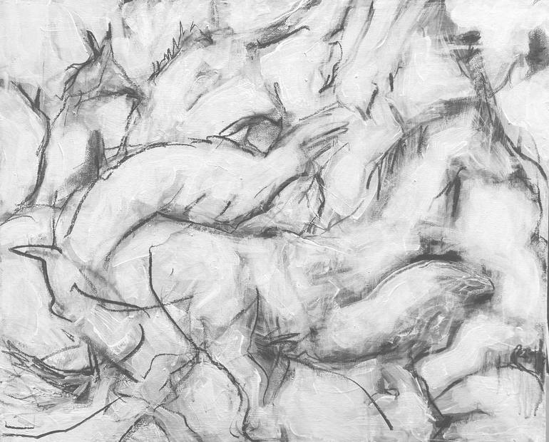 This little painting is part of a research into a dramatic photograph of a leaping horse. I wanted to find the essentials of the photo so that I could express it in simpler form. I tried a “travelling drawing” working across my preparatory drawings with a random approach, and this piece was the re...
