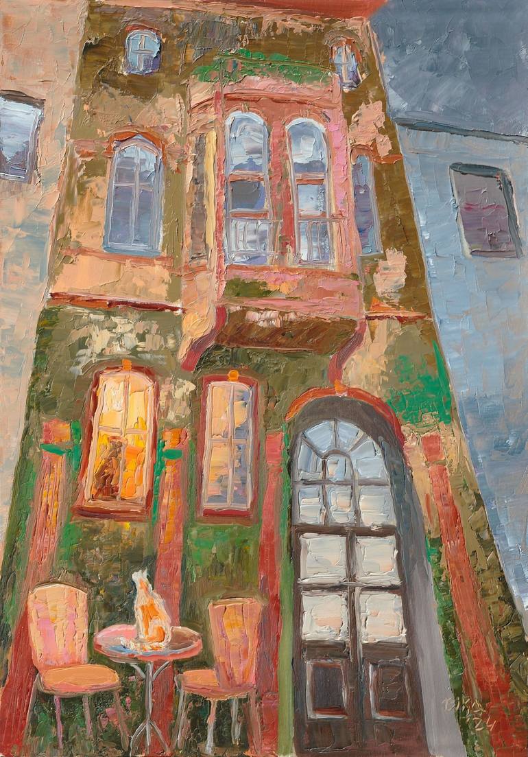 This oil painting, done in an impressionist style, portrays an old building at dusk. A soft, glowing light spills out from one of the windows, evoking a sense of warmth and comfort. In the foreground, a cat rests on a small table near the house, gazing curiously into the lit window, bringing a subtl...