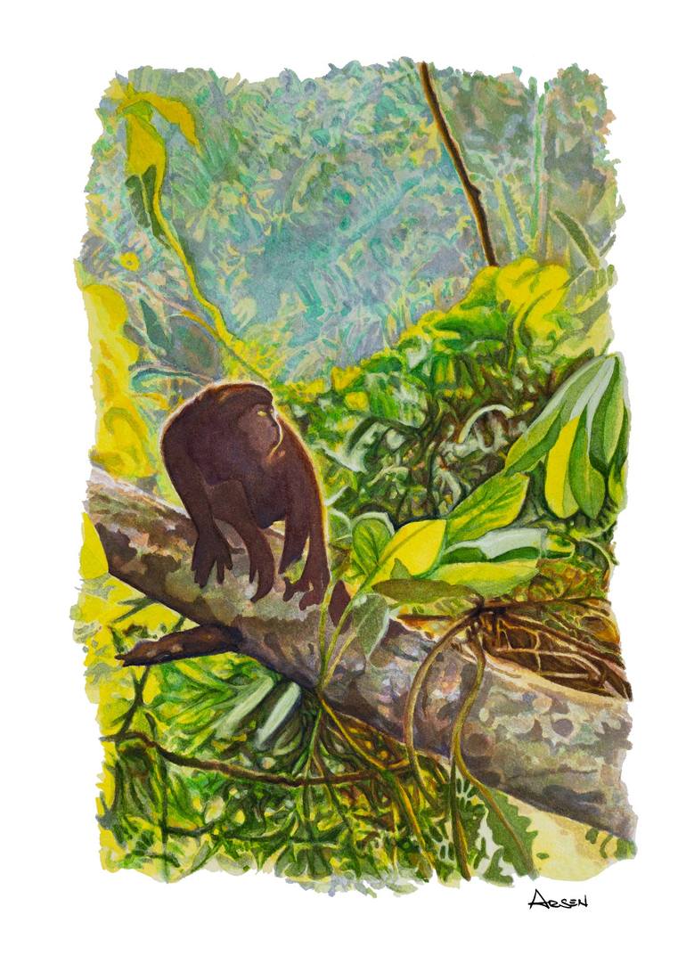 Howler Monkey's Domain: A Realm of Emerald Splendor Sunlight filters through the dense Costa Rican rainforest canopy in this watercolor masterpiece, titled "Howler Monkey." High above, a majestic howler monkey sits enthroned on a carao tree, its silhouette bathed in a warm glow. The scene stretch...