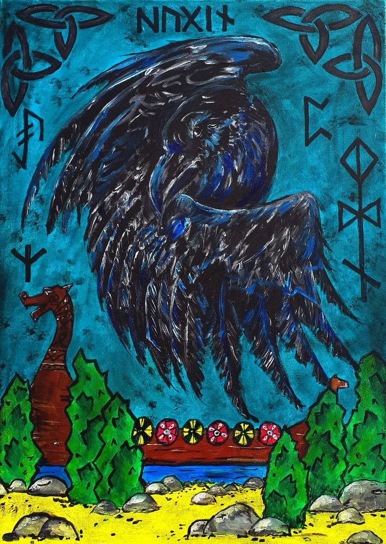 In this vibrant and captivating artwork, the enigmatic Huginn, the wise and watchful crow of Norse mythology, takes center stage amidst a kaleidoscope of bold colors. Set against a backdrop of a rocky coastline adorned with resilient juniper trees, the scene exudes an aura of ancient mysticism. Rune...