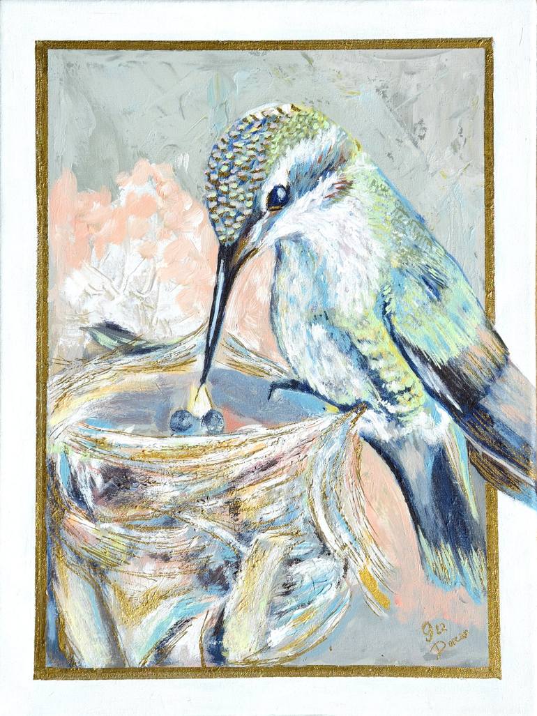 Golden details and cheerful colors. This magical and elegant painting, seems taken out of a romantic book. The hummingbird, in the Mayan culture, is believed the gods created it from a small jade arrow and its task is to carry the thoughts and desires of people from one place to another. Therefore, ...