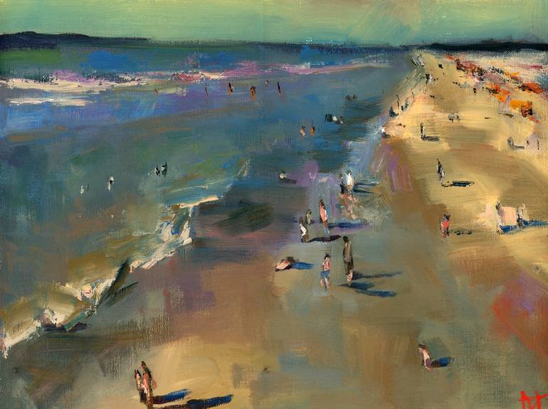 Huntington Beach is part of a series depicting vacations and leisure lifestyle.. I use subdued colors and loose brush strokes, as in most of my paintings, in order to create the mood and feel of spontaneity. Art buyers may see a symbolic reference to prominent 20th century American painters like Geo...