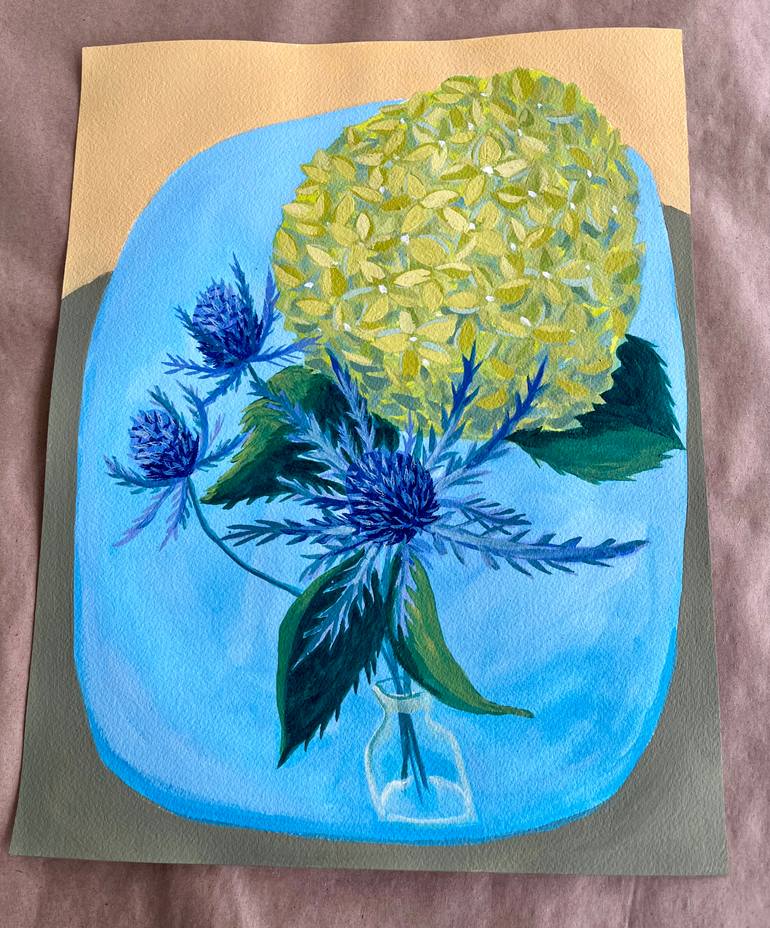 2024, gouache and flashe on paper, 14 x 11, unframed. A painting from a continuing series of floral still lives. Signed, dated, and titled on the back.