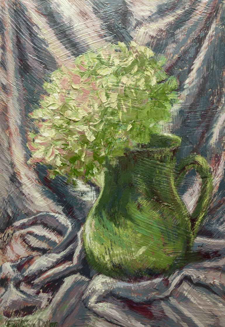 Working with still life on textured surface gives it another dimension. Painting is on wood panel. Not framed.