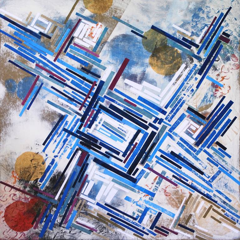 "Hymn", 2016, acrylic with cut paper and plaster dust on wood, 16 x 16 inches (40 x 40 cm). Many disparate voices flow together to create a whole that is greater than the sum of its parts. Cut and painted paper is layered with acrylic and plaster; some layers are sanded to partially reveal the lay...