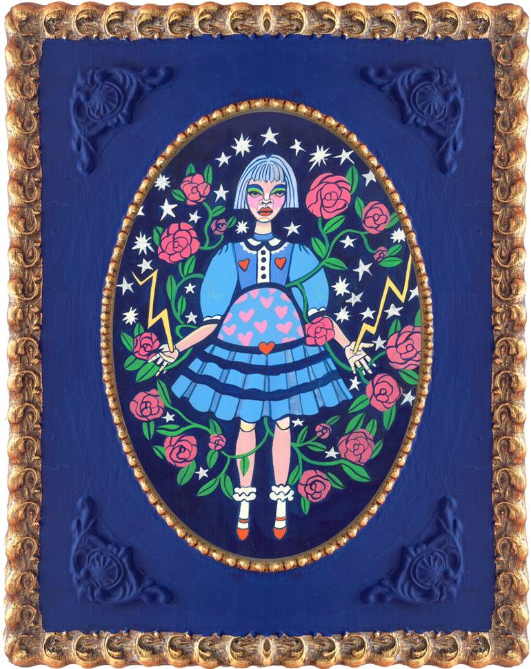Artist Meg Lionel Murphy’s paintings are informed by debilitating PTSD from severe domestic violence. Over the past few years, she has compulsively painted heartbroken femmes that magically grow larger, stronger, and scarier than the world around them. As the paintings grow in number, she grows just a little larger, stronger, and scarier too. Meg works from rural Wisconsin. She splits her time painting between a little blue shack in a junkyard and the storefront artist collective, The Yellow Room.