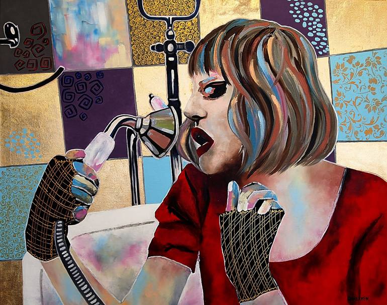 I Am a Star - Expressive Pop Art Acrylic and Oil Painting. 80X100cm, oil, acrylic, gold leaf on canvas. “I Am a Star” captures a moment of pure joy, self-expression, and living life to the fullest. Set in a karaoke session, it is a powerful testament to the beauty of embracing life’s spontaneous mo...