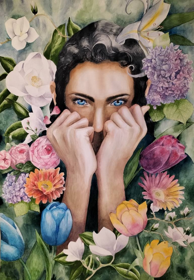 The girl is nurturing all the plants around her, in order to give them strength and energy to blossom and sprout. Many different species of flowers are depicted aronud her: magnolias, hydrangeas, tulips, peonies, gerbera flowers, a lilium... Flowers carry many meanings, but what I want to convey b...