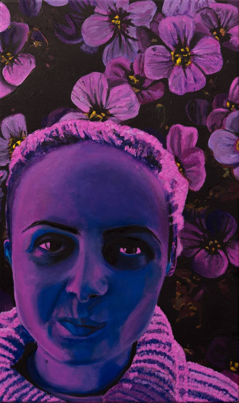 I was playing around with a filter on instagram, which I very rarely do and took this photo of my girlfriend with a cute corner smile. After some time I found the photo and turned it more purple, added the flowers and gave it an intense vibration with the saturation of the colors. The painting is ca...