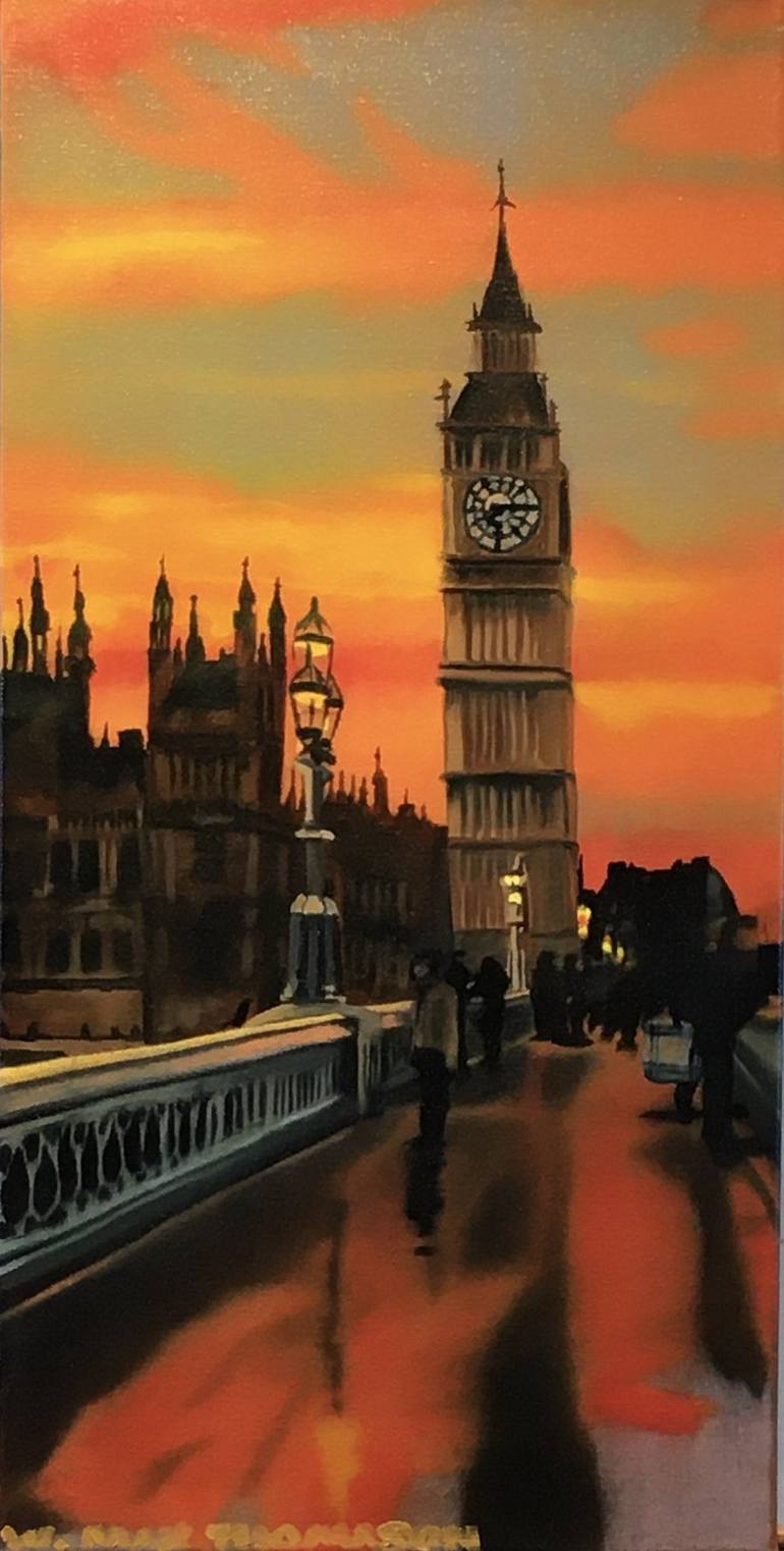 A painting of Big Ben from Westminster Bridge at dusk after a rain storm. The full title of the painting is I am Suddenly Aware I am Living in the Present, no Longer Trapped in a Past Memory or a Future Hope