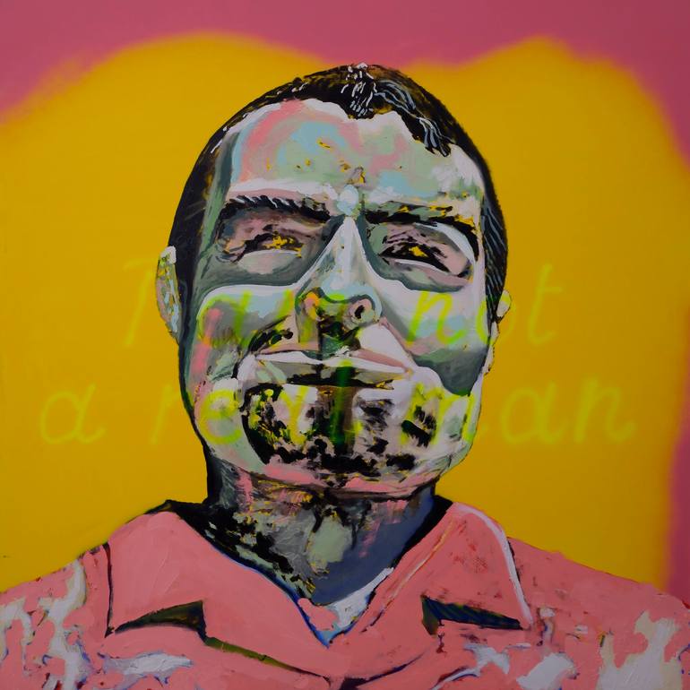 I AM NOT A REAL MAN is part of a series of portraits inspired by the "Muffler Man" roadside figures that are scattered throughout the United States. The paintings from this cycle are an attempt to visualize the stereotypes of masculinity rooted in popular culture.