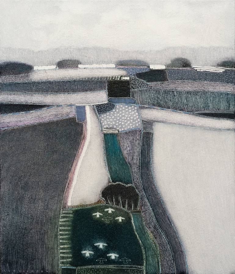 Rob van Hoek September 2012 Born 1957 Autodidact Professional artist since 1993 Numerous exhibitions in leading Dutch galleries, as well as in galleries in the United Kingdom (London ,Oxford, Newcastle), Denmark and France (St.Malo). My paintings have been shown at International art fairs (The Netherlands, UK, Belgium, France). Artist Statement Subject During all my years of painting I have been inspired by the landscape, especially the cultivated landscape. Wild, rough and virginal landscapes are beautiful too, but no subject of my paintings. The patterns, lines, rhythms and shapes of (harvested) fields, a line of trees along a road, a solitaire tree in a field, the houses which liven up the countryside; these are a few items that make the cultivated landscape so inspiring to me. And of course the sky above, adding space and atmosphere. Perspective is used in a playful way; sometimes flat, sometimes with depth, often both, and together with an emphasis on figurative details, it gives the paintings a more or less naive character. Painting Technique On the canvas I put at least 5 or 6 layers of white, gesso-like paint. The brush strokes of these layers give a nice structure. Because I use transparent oil paint in several very thin layers, the structure remains visible, adding much atmosphere to the painting. Instead of adding the paint precisely with a brush, I work the other way around; I put on a lot of paint and then I carefully remove some of it, while "drawing" in the wet paint with a brush, the backside of a brush, a cloth, a tissue, a Q-tip or whatever is suitable for making the lines, the forms, the dots etc. The Titles All the titles I use are lines (or parts of lines) from song lyrics. Mostly from pop music, sometimes a title of a jazz song. There are so many references to the landscape to be found, (and the sky, the weather, the time of day, the time of year, and so on), which I thankfully use. Usually I give the title to the painting when it is finished, browsing through my collection of songlines and selecting the most appropriate one. But sometimes I make a painting with a particular songline in mind. Working from this concept is inspired the novel "The Songlines", by Bruce Chatwin.