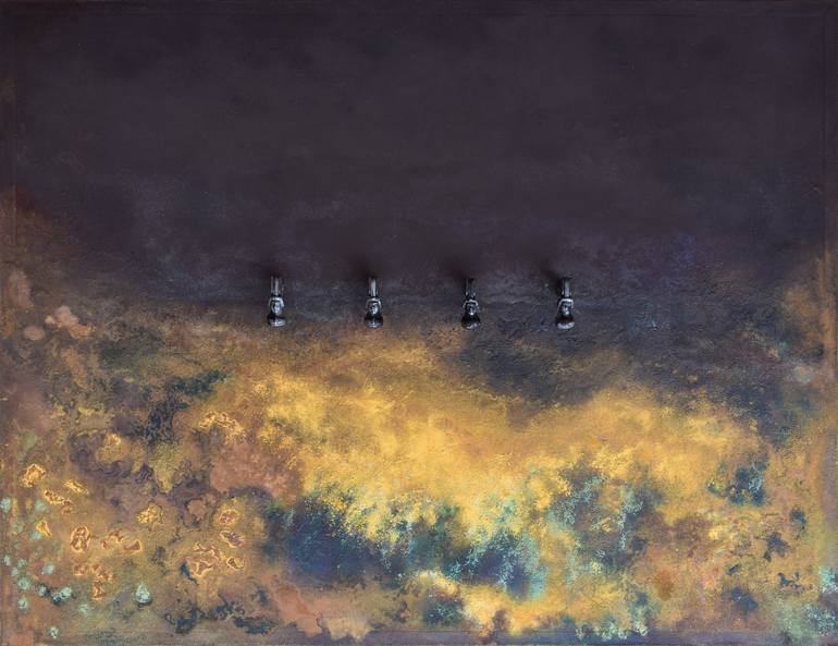 In this original painting, pigments and found objects blend to explore the relationship between the abstract and the metaphysical. A symbolic approach depicts the guardians of the ethereal, four enigmatic figures watching over a landscape of pure energy. The slightly three-dimensional artwork incorp...