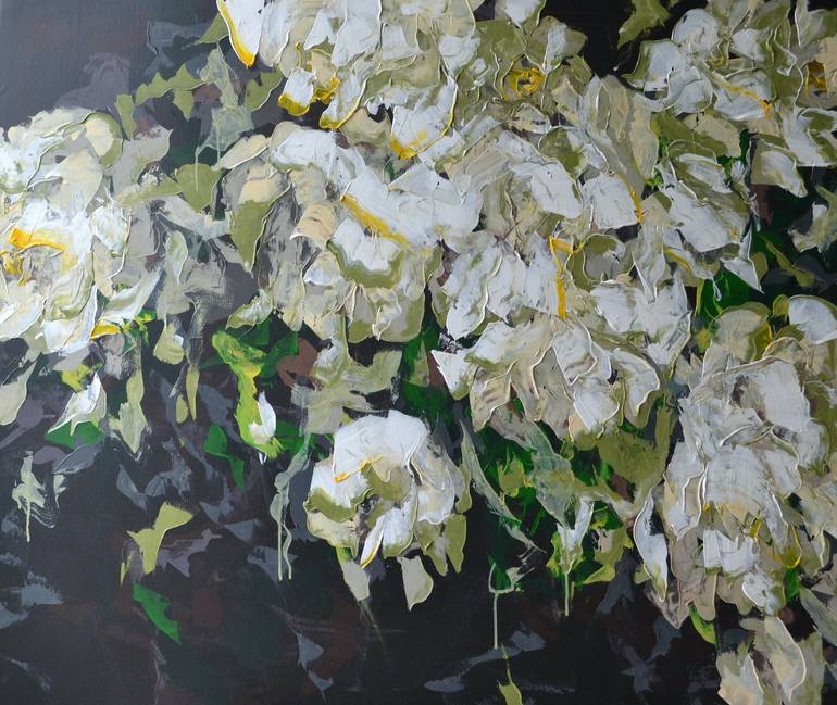Video review: https://youtube.com/shorts/cpqO-mwmrck?si=_P-AZIUOfRJOQSPv Tatiana’s new floral painting on canvas is a masterpiece that combines a dark background with stunning green leaves and straws, as well as striking white, beige, grey, and yellow flowers. The flowers are applied using a palett...
