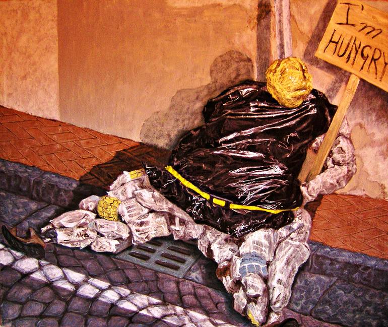 oil on felt. cm. 199 x 168. 2008 The painting depicts a puppet obese bum asking for food on a sidewalk. The work is carried out by mixing the raw pigments with linseed oil without using industrial colored tubes. the support is a canvas of pure felt fabric. The painting is mounted on a professional ...