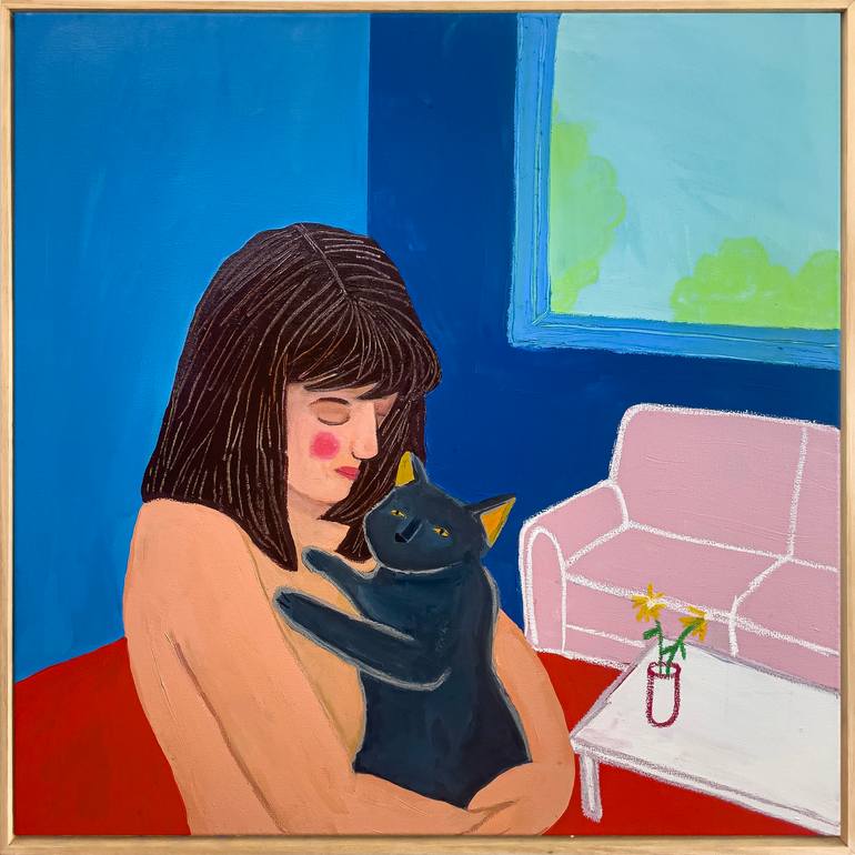 I Was Hers is an intimate, interior moment — a woman holding a black cat close, both of them melting into the comfort of each other. The space around them is simple: a pink couch, a window, a vase with flowers. But what’s happening between them is rich with feeling. Love, yes. But also possession, m...