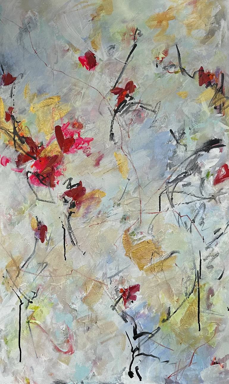 Original acrylic painting on linen by Viktoria Ganhao. This abstract artwork presents a dynamic interplay of colors and forms. Dominating the canvas are ethereal swirls of soft gray and white, creating a misty atmospheric background. Bold strokes of red and pink punctuate the composition, evoking a ...