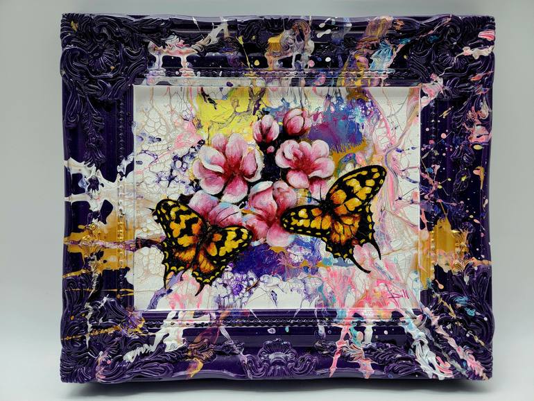 Two vibrant swallowtail butterflies enjoy the cherry blossom flowers as the fly over a splattered acrylic background which extends onto the frame. Swallowtail butterflies are so beautiful to me and I almost always stop to watch them in the spring and summer. As with all of my pieces this piece bega...