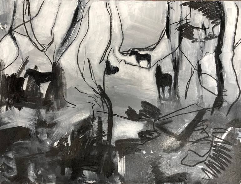 This black, white and mid-toned work using both paint and charcoal is inspired by a scene of horses living in a field near my house in Scotland. I am fascinated by the meditative stillness of the horses as they stand motionless near the trees, indifferent to urgency of human life in the streets nea...