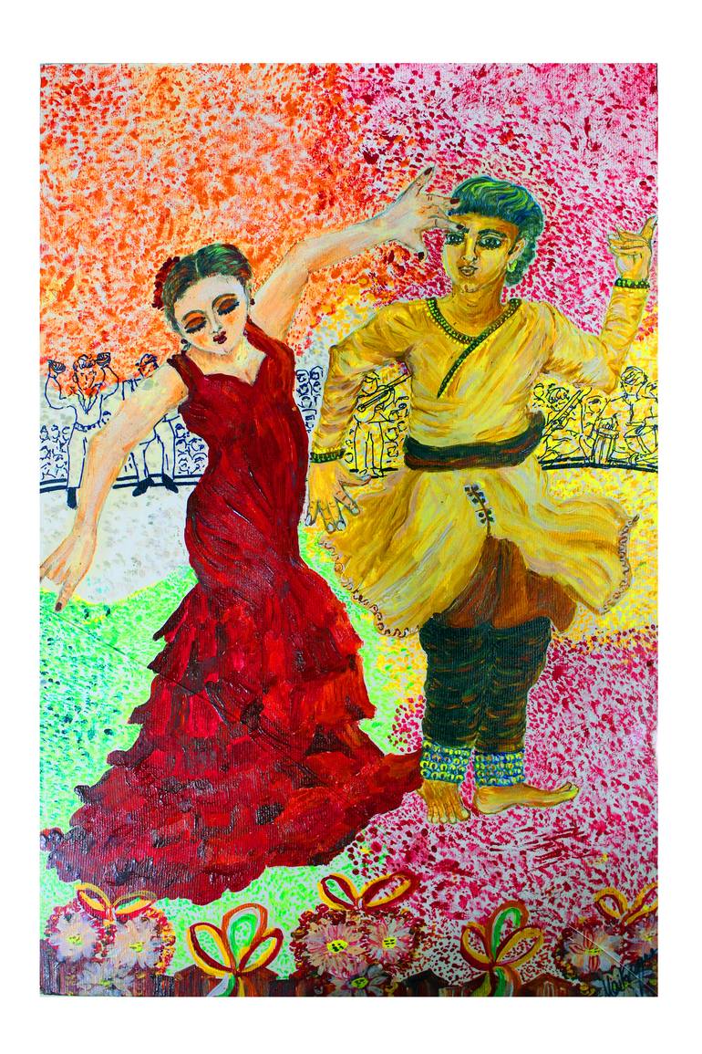 "Indo Spanish Dance Duo " is inspired from the similarity in two Dance forms -Indian "Kathak ' and Spanish 'Kathak " according to my opinion .Both Dance forms involve footsteps and are classical .I captured the two moods in Canvas paper with accrylic colours in oil medium, painting it in my own sign...