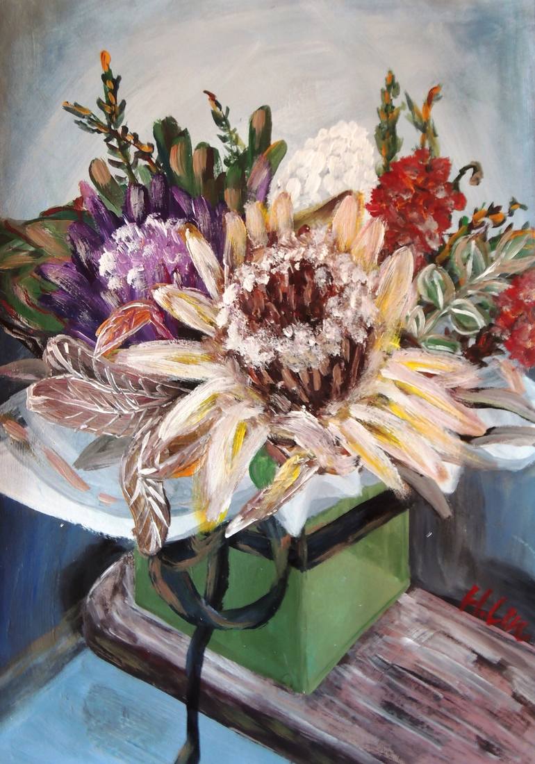 INSIDE THE GIFT BOX - Australian native dried flowers still life 5/9/2017 . H,Lin Artwork size-29.5*42*0.1 cm Framed size -62 x 45 X 3.5 cm Acrylic on Paper , framed , ready to hang Metallic Gold paint are used . The dried flower arrangement of portea flower, Dried Banksia Hookerana Flowers , ...