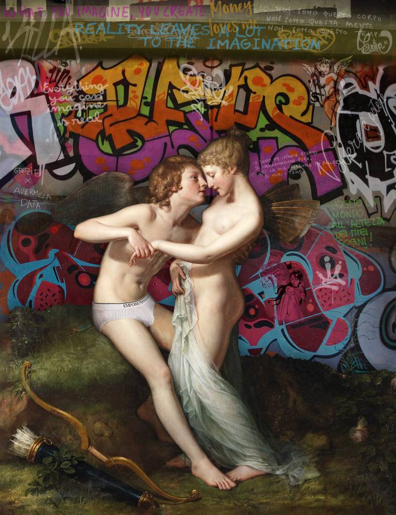 EXPLOSIVE JUXTAPOSITIONS With explosive juxtapositions, artist Marco Battaglini collides the principles of idealistic beauty, as epitomized in Renaissance painting, with the modern anarchic anti-consumerist ideology of graffiti, that espouses the transformative power of defacement. Enormous in scal...