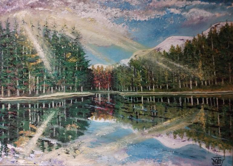 This captivating oil painting captures the serene beauty of Lake Irabia in Navarra. The artwork masterfully portrays the reflection of the shoreline trees on the calm waters, while the snow-capped peaks of the Pyrenees rise majestically in the distance, all bathed in the soft, warm light of a stunni...