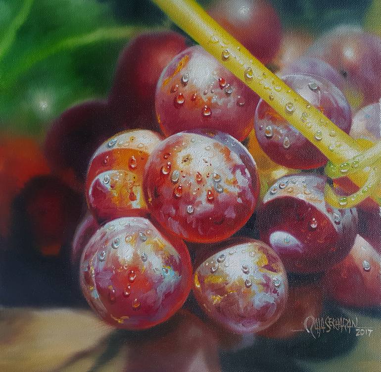 Oil painting by Rajasekharan. Hyper realistic painting. Grapes with water drops.